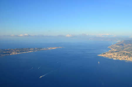 Scenic aerial view of the Strait of Messina, between the eastern tip of Sicily and the western tip of Calabria in the south of Italy, as seen from the top of Mount Sant'Elia, Palmi, Italy