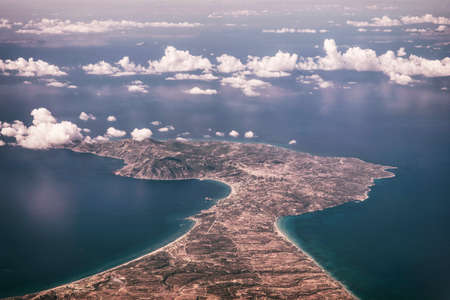 The view from an airplane in island of Cyprus. Seacoast line with blue Mediterranean sea and brown land.