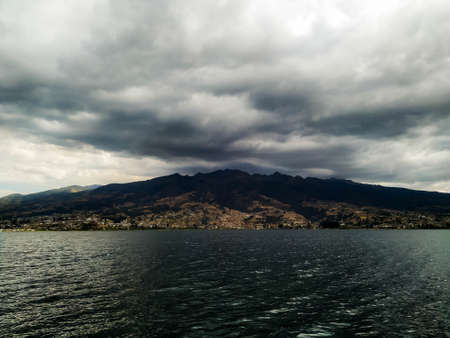 San Pablo lake and city of Otavalo behind climbing the mountain. This photo shows Lake San Pablo and the bottom of the Embabura volcano, located in Otavalo - Ecuador.