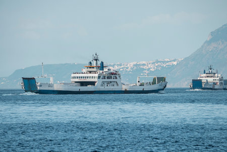 MESSINA, ITALY - AUGUST 13, 2024: Hybrid powered ferry ship Iginia in Messina Strait, Italy. Iginia carries railway rolling stock, cars and passengers.