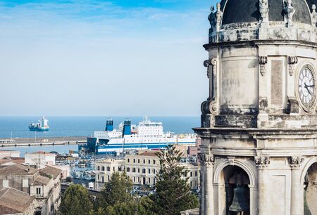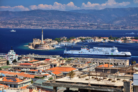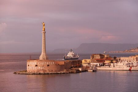 Messina, Sicily, Italy - October 7, 2017: View of the Messina's port with the gold Madonna della Lettera statue in Sicily, Italy.
