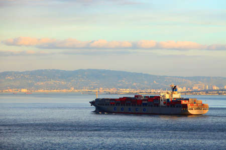Cosco Container ship in San Francisco Bay at sunset in city of San Francisco, California CA, USA.