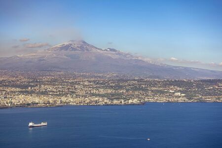 Breathtaking view of snowy mountain Etna. Location cape Milazzo, Sicily, region of Italy, Europe. Mediterranean resort. Scenic image of beautiful spring seascape. Discover the beauty of earth.