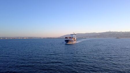 Large container ship sailing at sea in overcast morning close to the Rijeka town shoreline in Croatia, selective focus