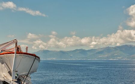 Cruise ship deck with lifeboat against cloudy sky background. Ligurian sea, Italy.