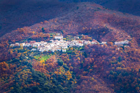 Majestic view of beautiful remote mountains in clouds and sunlight with town on hillside. Parauta in Malaga, Spain