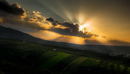 Beautiful view of the Valle del Sacco at sunset, from Anagni, Frosinone, Italy. Rays of light in the clouds, the mountains and the green valley.