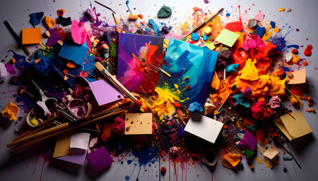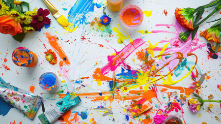 A bright and chaotic artist workspace featuring splashes of paint, brushes, and vibrant flowers creating an energetic atmosphere for creativity.