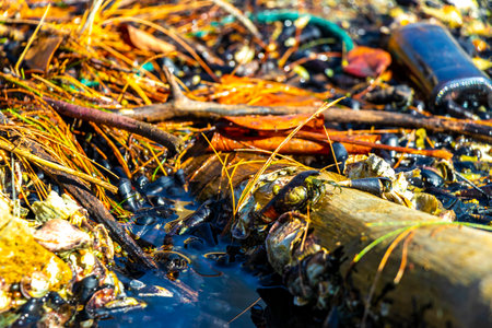 The problem of trash on the beach caused by man-made pollution and environmental in concept.