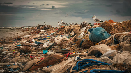 Environmental protection concept. Garbage dump on the seashore. AI generated.
