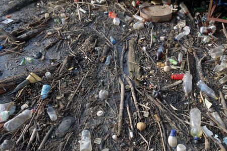 Plastic waste and debris uncovered during a waterfront environmental cleanup initiative