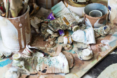 Used tubes of oil paint for painting pictures are lying on the table. Fine art set