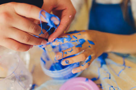 Ingredient for make home made Toy Called Slime, Teenager having fun and being creative homemade slime. Selective focus on Slime.
