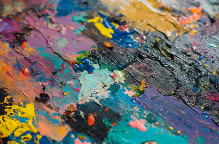 Close-up of colorful paint strokes creating a textured abstract background. Various hues and shades blend together.