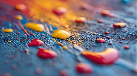A vibrant close-up of colorful paint drops scattered over a textured surface. The vivid colors blend and contrast beautifully, creating an artistic expression.