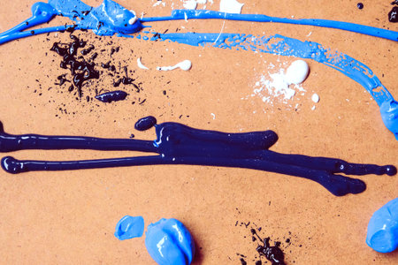 Colorful pour the paint texture on the surface of the wooden table. Splash acrylic multi color on old dirty wood table of children's artist table. Close up abstract background.