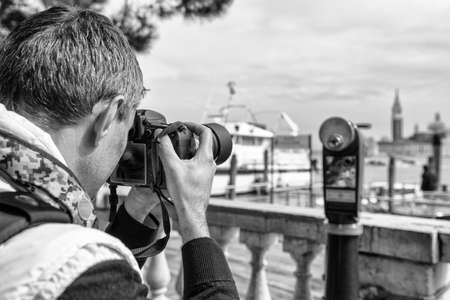 Adult Professional Photographer Looks Into The Viewfinder To Find The Best View Of The City For The Shot.