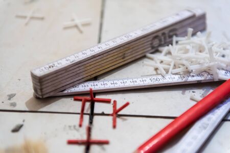 Ceramic tiles and tools for tiler ceramic tiles installation Home improvement, renovation ceramic tile adhesive, mortar, level