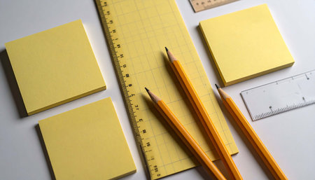 Flatlay of yellow sticky notes, pencils, and rulers on a white surface; simple, organized stationery