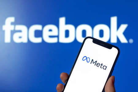 Maski, India - October 29, 2021 : Close up of hands holding Meta facebook's new name on mobile phone with facebook new logo on background