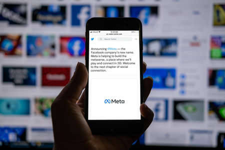 META new Facebook corporate name on smartphone social media rebranded, Menlo Park, California, USA, October 2021