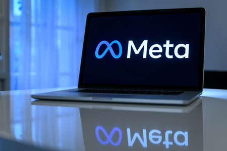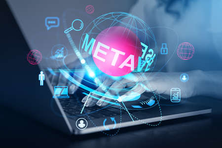 Laptop with Meta logo on display. New Mark Zuckerberg social. Computer with hands typing on keyboard. New technology, metaverse, beyond, virtual, cyber bubble concept. Milan, Italy - November 2021.