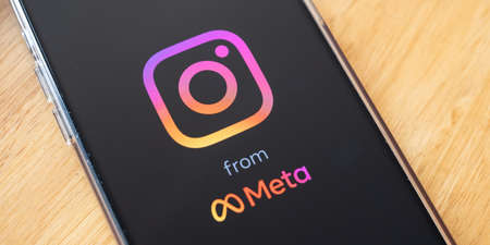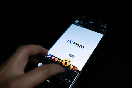 Facebook and Meta . Hand with mobile phone close-up
