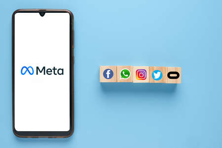 Kazan, Russia - Oct 28, 2021: Facebook changes its name to Meta. Smartphone with Meta logo on the background on logos of products owned by facebook metaverse.