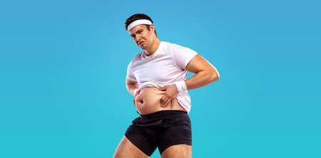 Fat man holding excessive fat belly, overweight fatty belly at fitness gym. Diet lifestyle, weight loss, stomach muscle, healthy concept.