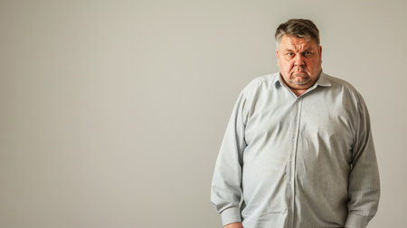 Overweight man with excess belly fat, copy space