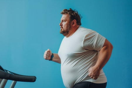 A man in a white shirt is running on a treadmill. He is overweight and he is in a hurry