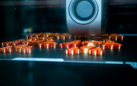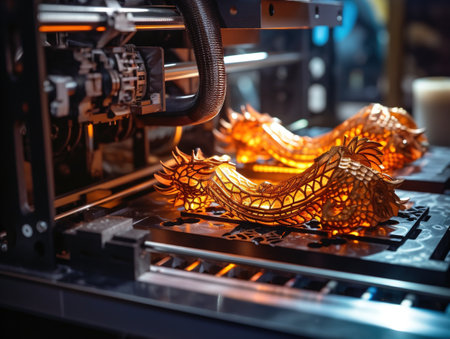 A 3D printer creating a detailed gold ornament, blending traditional craftsmanship with modern tech