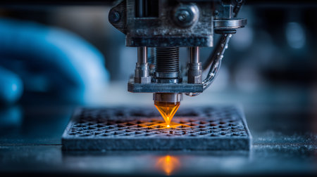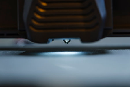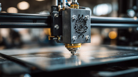 This image showcases a close-up view of a 3D printer's nozzle and print bed, highlighting the intricate details of the manufacturing process.