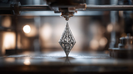 Metal jewelry prototype emerging from a 3D printer sharp focus on intricate metallic textures while the surroundings fade into soft focus.