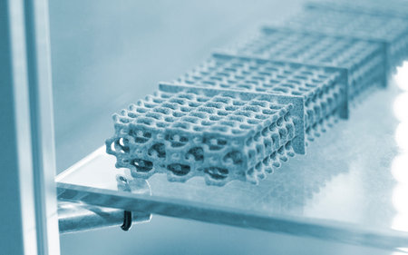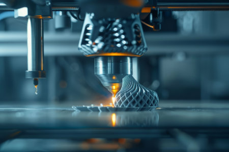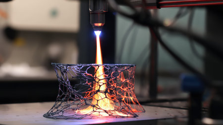 3D printer is producing a detailed lattice structure using laser technology, highlighting the innovative manufacturing process and modern design elements in a high-tech environment