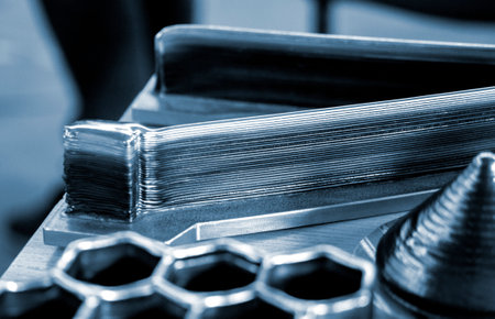 Object printed on metal 3d printer close-up. Object printed in laser sintering machine. Modern 3D printer printing from metal powder. Concept progressive additive DMLS, SLM, SLS 3d printing technology