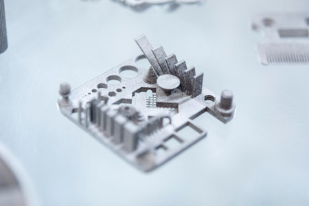 Object printed on metal 3d printer close-up. Object printed in laser sintering machine. Modern 3D printer printed from metal powder. Concept progressive additive DMLS, SLM, SLS