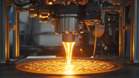 Industrial 3D printer precisely constructing a complex metal component layer by layer using a powerful laser, showcasing advanced additive manufacturing technology and innovation.