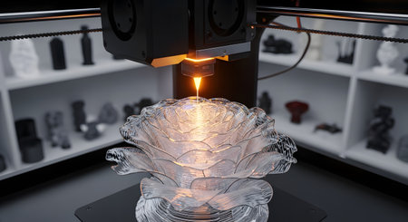 A close-up view of a 3D printer nozzle meticulously creating an intricate, translucent rose-shaped object. The glowing filament builds the delicate petals layer by layer, showcasing the precision of modern additive manufacturing and rapid prototyping technology.