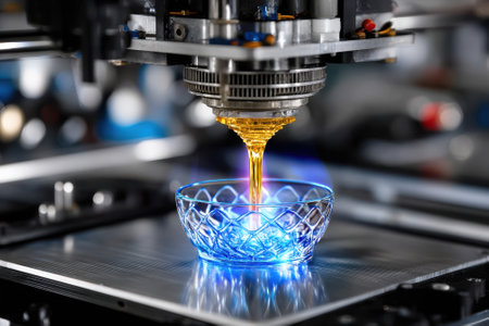 A robotic system dispenses a golden liquid into a crystal-like bowl within a high-tech manufacturing setting.