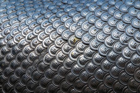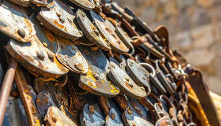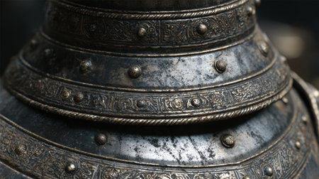 Close view of armor metal showing dents and wear revealing the history of use and craftsmanship in each detail of the surface.