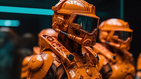 Close-up of a futuristic soldier's shoulder armor with gold star detail, generative Ai