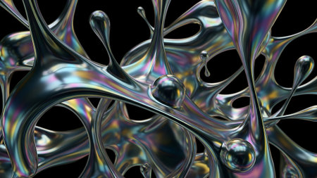Dynamic, iridescent liquid metal splashes frozen in motion against a stark black background, showcasing intricate, flowing forms and vibrant, shifting colors.