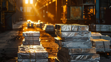 Metal Ingots. Rows of stacked metal ingots in a warehouse or factory setting.