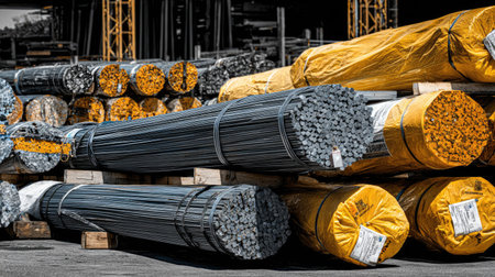 This image showcases stacks of steel rebars covered in yellow and grey materials, highlighting their crucial role in construction and industrial settings.