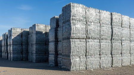 Bales of sorted plastic waste arranged in a recycling facility, symbolizing sustainability, waste management, and industrial processing.