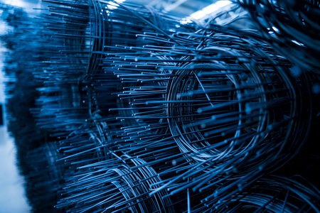 Metal coils of steel wire are neatly organized in rows, reflecting sunlight at a construction site. The industrial setting highlights the materials used in building and manufacturing.