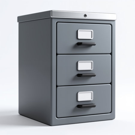 A gray filing cabinet with three drawers, symbolizing organization and storage, is set against a plain white background, representing office supplies.