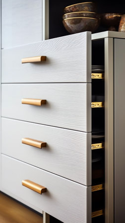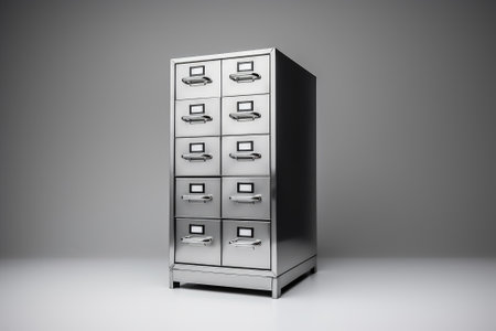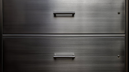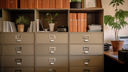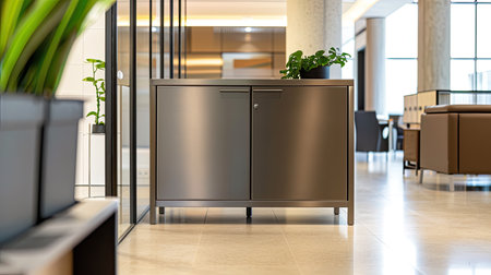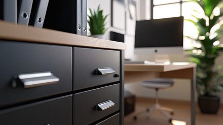 Close-up of a sleek filing cabinet and desk in a modern office setting, with ample copy space