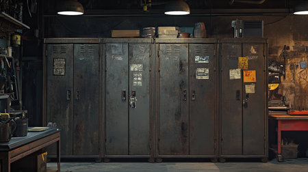 Explore the essence of a vintage workshop featuring industrial metal lockers. This image captures a nostalgic atmosphere filled with creativity and natural light.